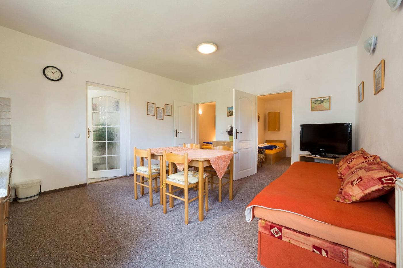 One-Bedroom Apartment (3 Adults). This apartment features fully equipped kitchen, WiFi and a satellite TV. In the bedroom there is a double bed, in the living room there is a single bed.
