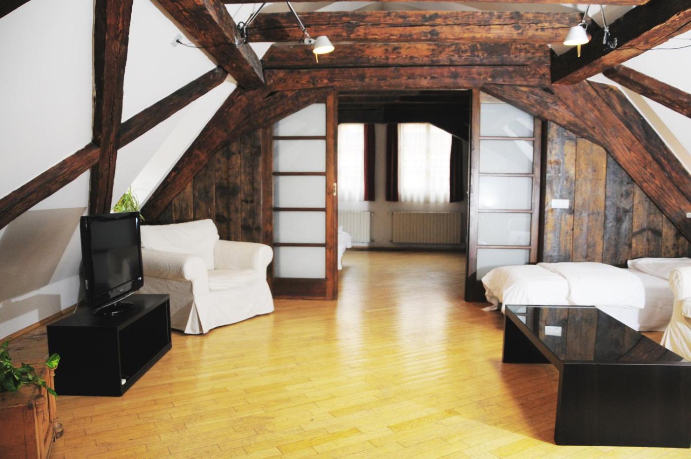 Penthouse Apartment. This loft-style penthouse apartment offers 2 partially separate bedrooms, panoramic views over the city, the park and the castle, a fully equipped kitchen and a bathroom with a spa bath. ;