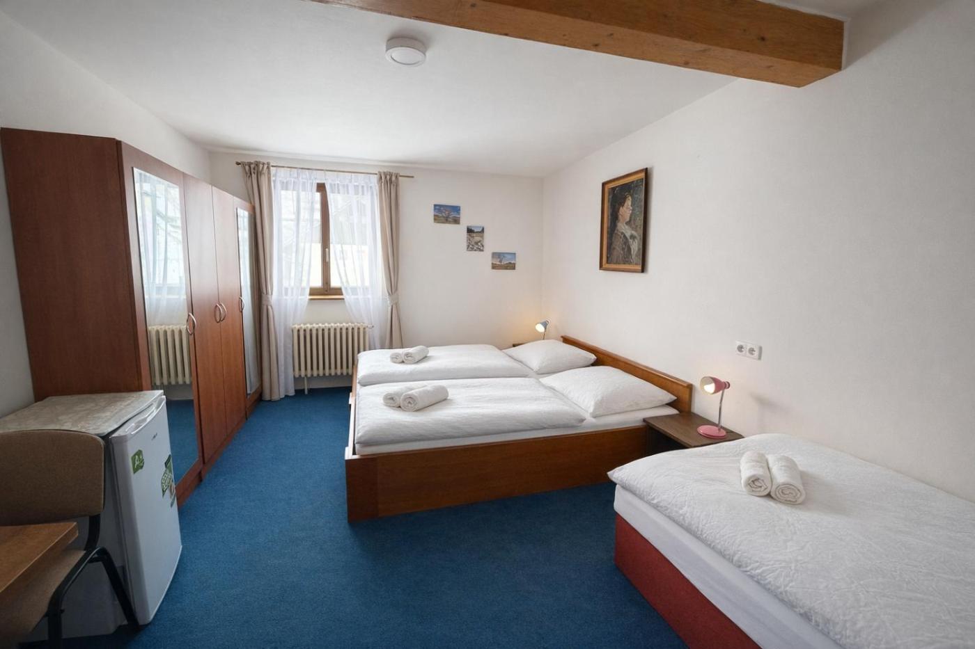 Room #190194612. This triple room features a shared bathroom and heating. The triple room is furnished with a desk and a seating area and provides a wardrobe, a carpeted floor and garden views. The unit offers 3 beds. ;