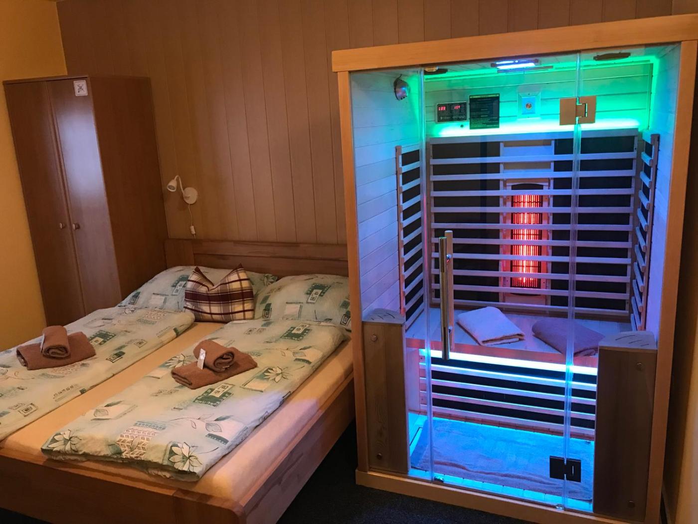 Double Room with Sauna. The sauna is a top feature of this double room. Featuring free toiletries, this double room includes a private bathroom with a shower and a hairdryer. The spacious double room features soundproof walls, a tea and coffee maker, a seating area, a wardrobe and a flat-screen TV with streaming services. The unit has 2 beds. ;